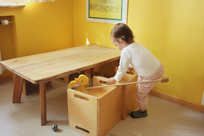 Im wilden Bereich haben wir unsere Instrumente und Baumaterialien und bieten hier wechselnde Bewegungsangebote, wie beispielsweise eine große Tobematte oder Fahrzeuge an. Durch diese Raumgestaltung können wir gewährleisten, dass die Kinder, denen gerade mehr nach Ruhe ist ebenso einen Ort in der Krippe haben, wie jene, die es gerade lebendig brauchen. Auch können wir hierdurch parallel Angebote für die unterschiedlichen Alters- oder Interessensgruppen ermöglichen.