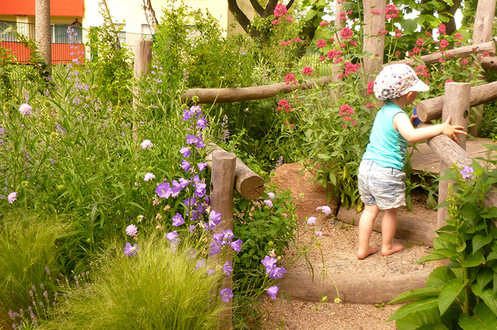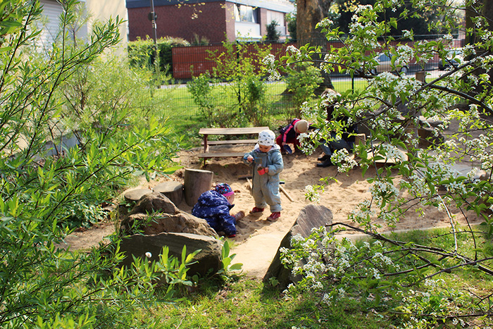 Bei der Gestaltung unseres Außengeländes wurde darauf geachtet, dass der Garten naturnah angelegt ist. So bietet er mit heimischen Pflanzen, großen Steinen und Hölzern, organisch angelegten Wegen und vielfältigen Untergründen reichlich Anregungen. Kräuter, Früchte und Blumen fördern die Sinne der Kinder. Hügel, Stämme und Stufen dienen als motorische Herausforderung. Käfer, Pfützen und Matsch spielen mit dem Forscherdrang. Eingebettet in die natürlich gehaltenen Räume gibt es einen Sandbereich, Schaukel und Rutsche, so dass jedes Kind im Garten eine Ecke findet, in der es tätig werden möchte.
