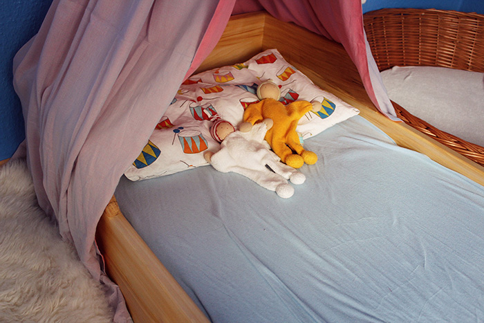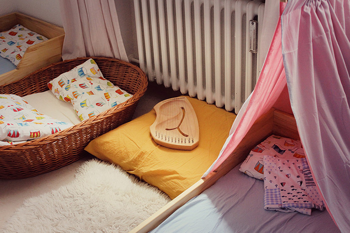 Im Schlafbereich ist alles so gestaltet, dass die Kinder hier friedlich und von uns begleitet zur Ruhe kommen. Weiche Lammfelle, leise Musik von unserer Leier und ein warmes Schlummerlicht sorgen für Geborgenheit, wenn jedes Kind in seinem Bettchen oder Schlafkorb zum Mittagsschlaf kommt.